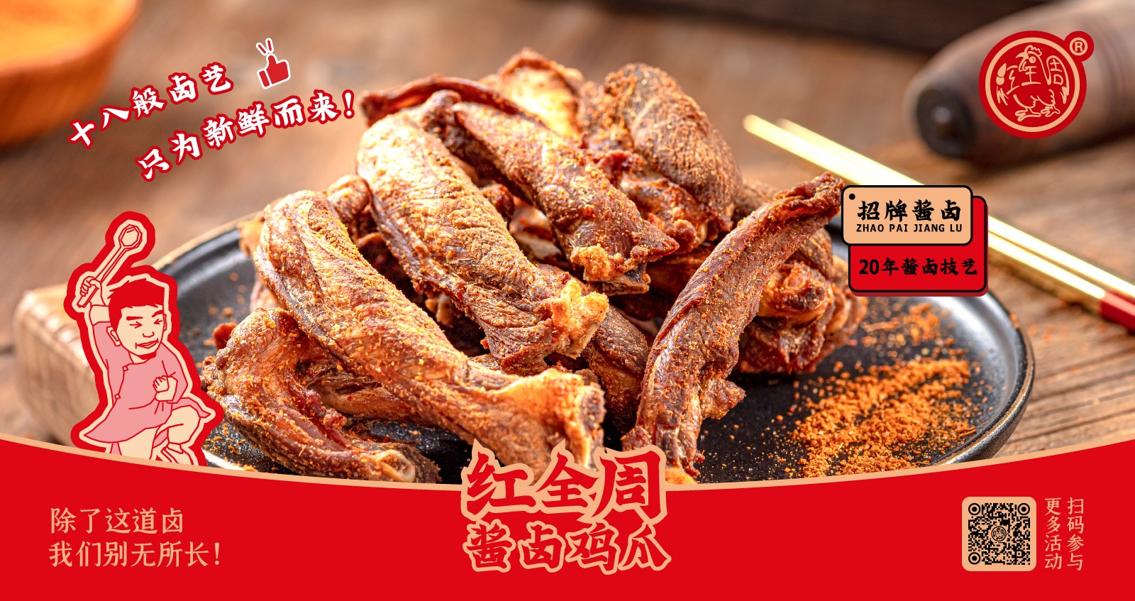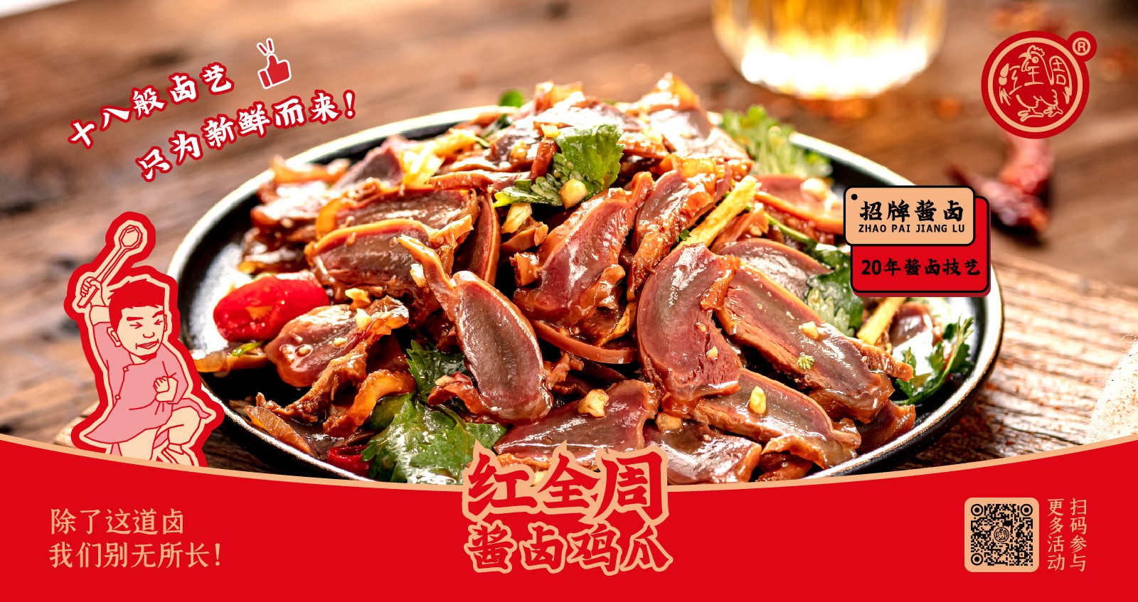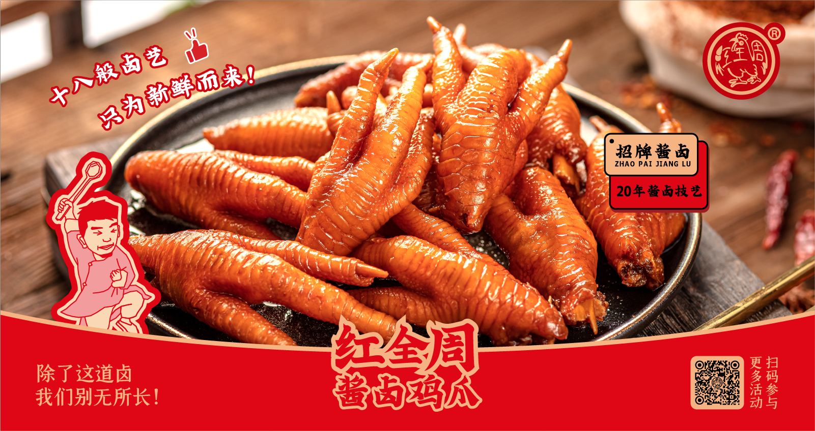 紅全周品牌創立于2012年,其生產總部坐落在以“紅全周雞爪”聞名的福建泉州市南安洪瀨鎮,經張福來師傅多年研制而成的獨家秘方,獨特的鹵制工藝,以“鮮、香、韌、辣”的特點,贏得廣大食客的交口稱贊。紅全周繼承中華美食傳統,堅持以“細微處見風范,毫厘間定乾坤”的服務準則,遵循現代健康飲食理念,精選上等食材,致力為消費者提供安全、健康的美食新體驗。